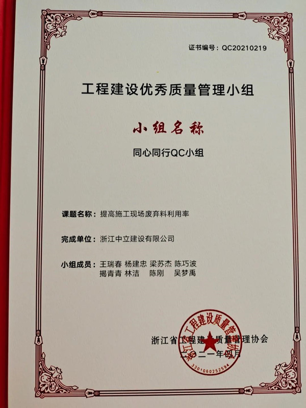 近日,從中建協(xié)傳來喜訊,中立公司逐夢之筑QC小組獲工程建設(shè)質(zhì)量管理小組活動成果大賽Ⅰ類成果。今年我公司QC成果取得豐碩成績,另外樹人之心QC小組獲得浙江省優(yōu)秀QC成果一等獎1項、同心同行QC小組獲浙江省優(yōu)秀質(zhì)量管理小組。