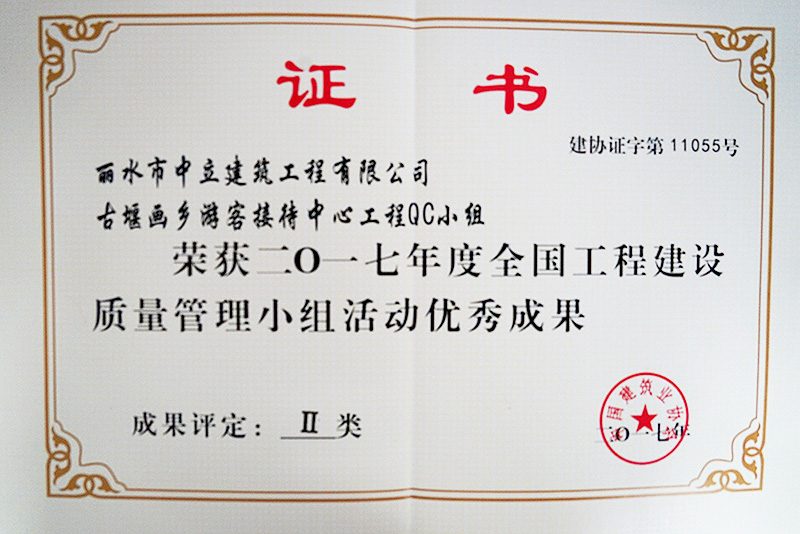 中國(guó)建筑業(yè)協(xié)會(huì)于2017年6月30日至7月4日在四川省成都市舉行2017年度全國(guó)工程建設(shè)優(yōu)秀質(zhì)量管理小組發(fā)布會(huì),我公司古堰畫(huà)鄉(xiāng)游客接待中心工程QC小組的活動(dòng)課題:“提高夯土墻飾面層質(zhì)量合格率”被評(píng)為2017年全國(guó)工程建設(shè)優(yōu)秀質(zhì)量管理小組二等獎(jiǎng)。